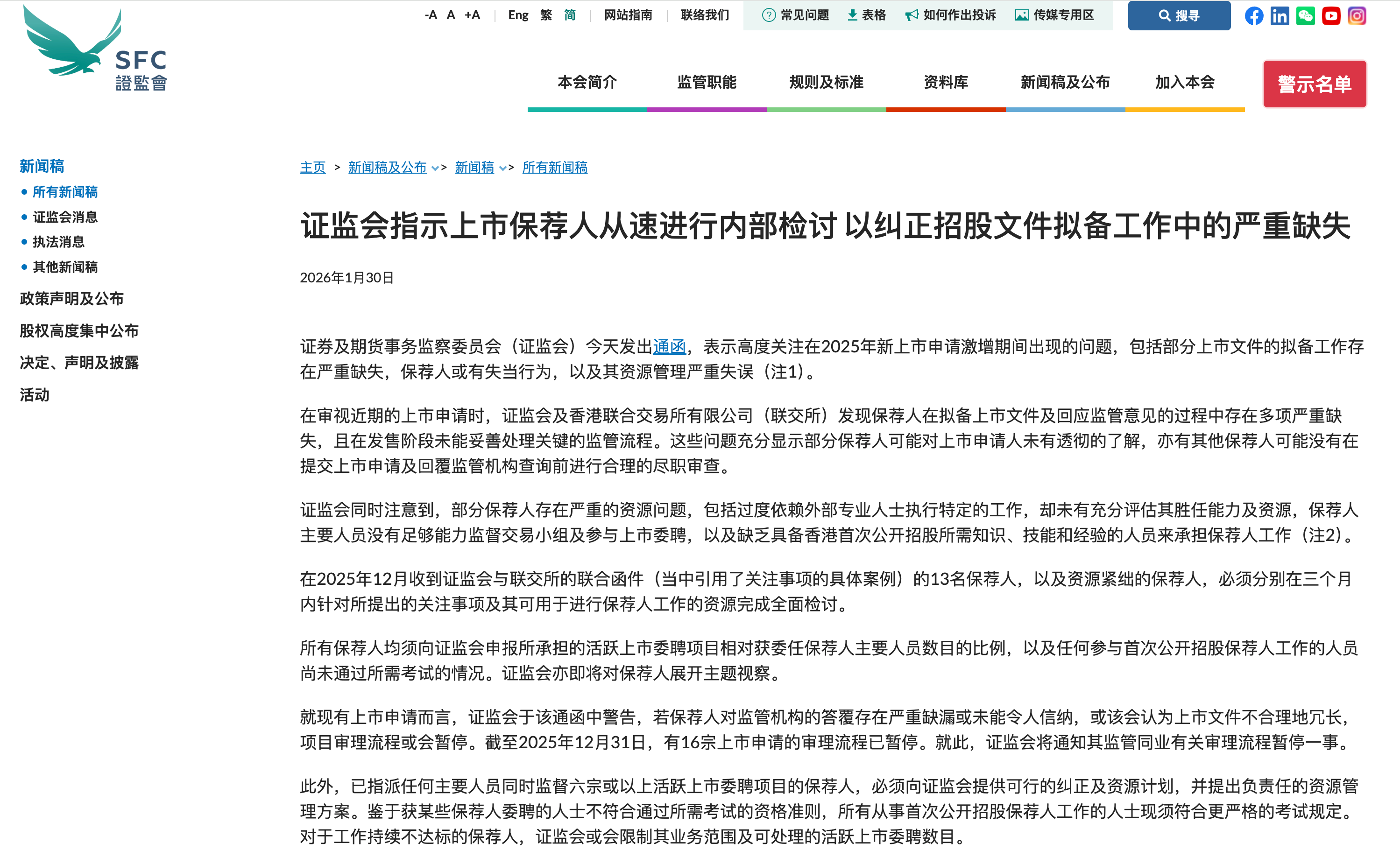 1月30日,香港证券及期货事务监察委员会(以下简称"香港证监会")发出通函,表示高度关注在2025年新上市申请激增期间出现的问题,包括部分上市文 件的拟备工作存在严重缺失,保荐人或有失当行为,以及其资源管理严重失误。 据悉,保荐人工作不达标可能构成不遵守《香港证券及期货事务监察委员会持牌人或注册人操守准则》《企业融资顾问操守准则》《保荐人指引》及《上市 规则》所指的保荐人责任。 图片来源:香港证监会官网 在审视近期的上市申请时,香港证监会及香港联合交易所有限公司(以下简称"香港联交所")发现保荐人在拟备上市文件及回应监管意见的过程中存在多项 严重缺失,且在发售阶段未能妥善处理关键的监管流程。这些问题充分显示部分保荐人可能对上市申请人未有透彻的了解,亦有其他保荐人可能没有在提交 上市申请及回复监管机构查询前进行合理的尽职审查。 香港证监会同时注意到,部分保荐人存在严重问题,包括过度依赖外部专业人士执行特定的工作,却未充分评估其胜任能力,保荐人主要人员没有足够能力 监督交易小组及参与上市委聘,缺乏香港市场首次公开招股所需知识、技能和经验。 该通函亦提醒保荐人,于上市申请过程中应向监管机构提供准确、完整及不具误导成 ...