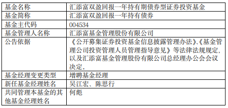 汇添富双盈回报一年持有债券增聘吴江宏陈思行
