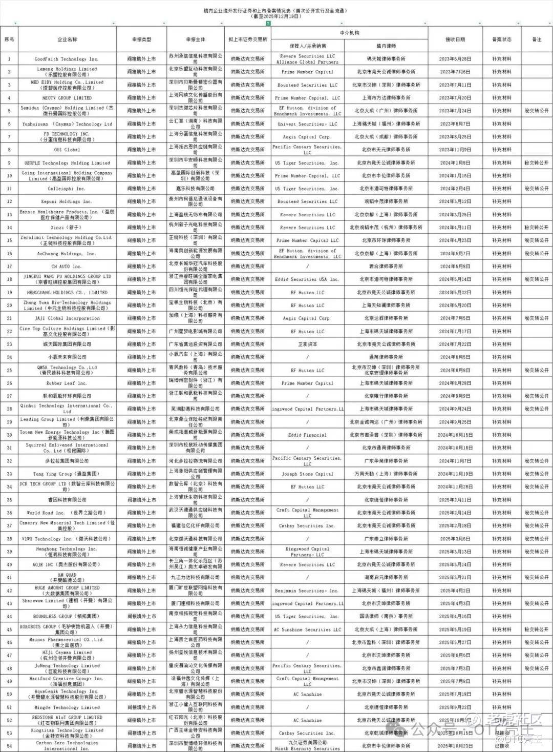 截至2025年12月19日,根据证监会公开披露信息,证监会累计已接收888家境内企业的境外首次公开发行上市(含全流通)的备案申请,共有412家企业取 得相关备案通知书。 其中,香港联交所721家,纽约证券交易所5家,纳斯达克交易所150家,台湾证券交易所8家,阿斯塔纳国际交易所1家、瑞士交易所1家、新加坡证券交易 所2家。 2025年12月15日-2025年12月19日,根据证监会公开披露信息,此次是54家企业申请赴美上市,较上次数据更新减少一家企业。 | 填内企业境外发行证券和上市备票情况表(首次公开发行及全流通) | (聚英303P曲IS目I3日) | | | | | | | | | | | | | | | | | | | --- | --- | --- | --- | --- | --- | --- | --- | --- | --- | --- | --- | --- | --- | --- | --- | --- | --- | --- | | 中介根构 | ਫਿੱ ਜ਼ੁੰ | 无非常感 | 申报类图 | 拟上市证券交易所 | 瑞欣日期 | 學生就要 | 是 无 | 电装毛体 | 保存人/主承销商 ...