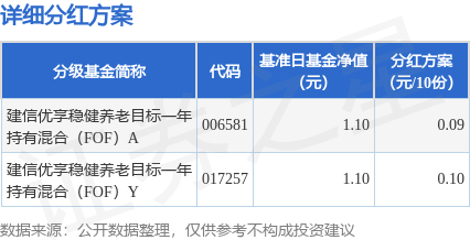 本次分红对象为权益登记日登记在册的本基金全体份额持有人。,权益登记日为10月24日,现金红利发 放日为10月27日。选择红利再投资方式的投资者所转换的基金份额将以2025年10月22日的基金份额净值 为计算基准确定,该部分基金份额将于2025年10月27日直接计入其基金账户,2025年10月28日起可以查 询、赎回。根据财政部、国家税务总局的相关规定,基金向投资者分配的基金收益,暂免征收所得税。 本基金本次分红免收分红手续费;选择红利再投资方式的投资者其红利所转换的基金份额免收申购费 用。 以上内容为证券之星据公开信息整理,由AI算法生成(网信算备310104345710301240019号),不构成 投资建议。 证券之星消息,10月22日发布《建信优享稳健养老目标一年持有期混合型基金中基金(FOF)分红公 告》。本次分红为本基金2025年度的第一次分红。公告显示,本次分红的收益分配基准日为9月9日,详 细分红方案如下: | 分级基金简称 | 代码 | 基准日基金净值 (元) | | 分红方案 (元/10分) | | | --- | --- | --- | --- | --- | --- | | 建信优享稳健 ...