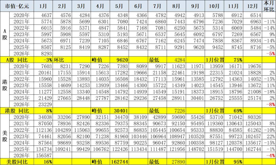 Group 1 - The market capitalization of automotive companies reflects not only their current operational performance but also industry trends, technological changes, and policy directions [1] - The market capitalization of global automotive companies is largest in the US stock market, reaching 15.66 trillion yuan in January 2026, a 4% decrease from December, but a 16% increase year-on-year [1][4] - The Hong Kong stock market reached a market capitalization of 2.32 trillion yuan in January 2026, down 8% from December but up 8% year-on-year [1][4] - The domestic A-share market reached a market capitalization of 829.3 billion yuan in January 2026, down 5% from December and down 3% year-on-year [1][4] Group 2 - The market capitalization of automotive parts in January accounted for 23%, an increase from 21% in the same period last year, while the market capitalization of complete vehicle companies decreased to 67% from 71% [1][4] - The A-share market has seen a relatively slow growth in automotive companies, while the US market has experienced significant growth driven by AI trends and the success of companies like Tesla [4][7] - The performance of major automotive stocks in January showed significant changes, with Tesla's market capitalization reaching 112.54 billion yuan, reflecting a strong performance [4][6] Group 3 - The valuation metrics such as PE and PB ratios indicate that traditional international automotive companies like Toyota and Ford are trading at lower valuations, typically between 5 to 9 times PE, while new energy companies like Tesla have much higher valuations [9] - The market capitalization of companies like BYD and Chery is around 10 times PE, indicating a relatively strong performance among traditional domestic automakers [9]
