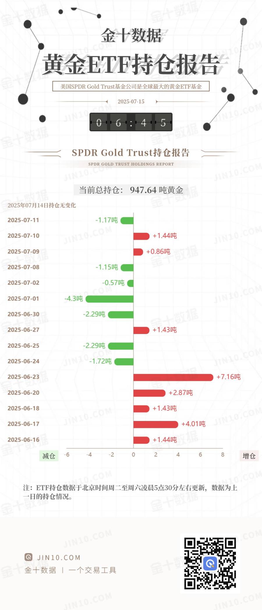 Group 1 - The largest gold ETF, SPDR Gold Trust, saw a decrease in holdings by 1.17 tons, bringing the current holdings to 947.64 tons [1] - The ETF's holdings data is updated around 5:30 AM Beijing time from Tuesday to Saturday, reflecting the previous day's holdings [4] - Recent trends show fluctuations in holdings, with increases and decreases recorded on various dates, including a notable increase of 2.87 tons on June 23, 2025 [3]
