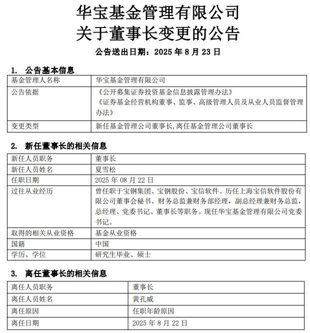 深圳商报·读创客户端记者 宁可坚 近日,华宝基金公告,董事长黄孔威因任职年龄原因卸任,来自宝武集团的"老将"夏雪松担任新董事 长。 事实上,在正式任命董事长之前,夏雪松已经出任华宝基金党委书记。 | 基金管理人名称 | 华宝基金管理有限公司 | | --- | --- | | 公告依据 | 《公开募集证券投资基金信息披露管理办法》 | | | 《证券基金经营机构董事、监事、高级管理人员及从业人员监督管理 | | | 办法》 | | 变更类型 | 新任基金管理公司董事长,离任基金管理公司董事长 | | 新任人员职务 | 重事长 | | --- | --- | | 新任人员姓名 | 夏雪松 | | 任职日期 | 2025 年 08月 22 日 | | 过往从业经历 | 曾任职于宝钢集团、宝钢股份、宝信软件。历任上海宝信软件股份有 | | | 限公司董事会秘书、财务总监兼财务部经理,副总经理兼财务总监, | | | 总经理、党委书记、董事长等职务。现任华宝基金管理有限公司党委 | | | 书记。 | | 取得的相关从业资格 | 基金从业资格 | | 国籍 | 中国 | | 学历、学位 | 研究生毕业、硕士 | | ...