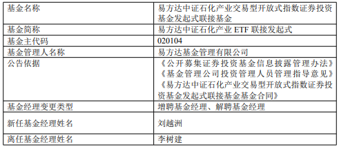 李树建2018年7月至2021年1月任国泰君安证券股份有限公司研究助理、分析师。2021年1月起在易方达 基金管理有限公司任职,先后任研究员、基金经理助理、基金经理、指数研究部总经理助理。 | 基金名称 | 易方达中证消费 50 交易型开放式指数证券投资 | | --- | --- | | | 基金 | | 基金简称 | 易方达中证消费 50ETF | | 基金主代码 | 159798 | | 基金管理人名称 | 易方达基金管理有限公司 | | 公告依据 | 《公开募集证券投资基金信息披露管理办法》 | | | 《基金管理公司投资管理人员管理指导意见》 | | | 《易方达中证消费 50 交易型开放式指数证券投 | | | 资基金基金合同》 | | 基金经理变更类型 | 增聘基金经理、解聘基金经理 | | 新任基金经理姓名 | 吕方 | | 离任基金经理姓名 | 李树建 | 易方达中证石化产业ETF联接发起式A/C成立于2024年1月5日,截至2025年11月28日,其今年来收益率 为17.56%、17.24%,成立来收益率为29.73%、29.01%,累计净值为1.2973元、1.2901元。 易方达中证消 ...