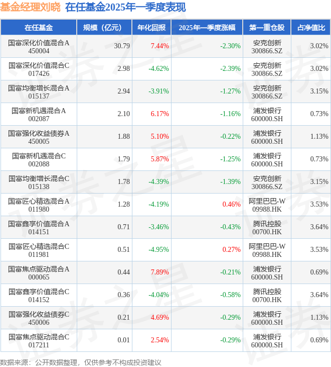 证券之星消息,截止2025年一季度末,基金经理刘晓旗下共管理14只基金,本季度表现最佳的为国富匠心精选混合A(011980),季度净值涨 0.46%。 | 在任基金 | 规模(亿元) | 年化回报 | 2025年-季度涨幅 | 第一重合股 | 白净值比 | | --- | --- | --- | --- | --- | --- | | 国富深化价值混合A | 30.79 | 7.44% | -2.30% | 安克创新 | 3.02% | | 450004 | | | | 300866.SZ | | | 国富深化价值混合C | 2.98 | -4.62% | -2.39% | 安克创新 | 3.02% | | 017426 | | | | 300866.SZ | | | 国富均衡增长混合A | 2.94 | -3.91% | -1.27% | 安克创新 | 3.15% | | 015137 | | | | 300866.SZ | | | 国富新机遇混合A | 2.10 | 6.17% | -1.16% | 浦发银行 | 0.73% | | 002087 | | | | 600000.SH | | | 国富强化收 ...