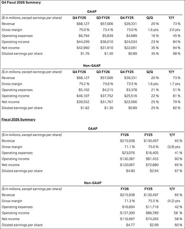 在此起彼伏的AI泡沫担忧声中,AI巨头英伟达依然稳定地超预期增长。 2月26日,英伟达公布了2026财年第四季度财报(截至2026年1月25日,相当于自然年2025年第四季度),营收和利润都双位数攀升,再创历史 新高。 Q4当季营收681.27亿美元,同比增长73%,环比增长20%;净利润高达429.6亿美元,同比增长94%,环比增长35%;毛利率提高到了75%。 | | | Revenue by Market Platform | | | | | --- | --- | --- | --- | --- | --- | | ($ in millions) | Q4 FY26 | Q3 FY26 | Q4 FY25 | Q/Q | Y /Y | | Data Center | $62.314 | $51,215 | $35,580 | 22 % | 75 % | | Compute | 51.334 | 43.028 | 32.556 | 19 % | 58 % | | Networking | 10.980 | 8.187 | 3.024 | 34 % | 263 % | | Gaming | 3.727 | ...