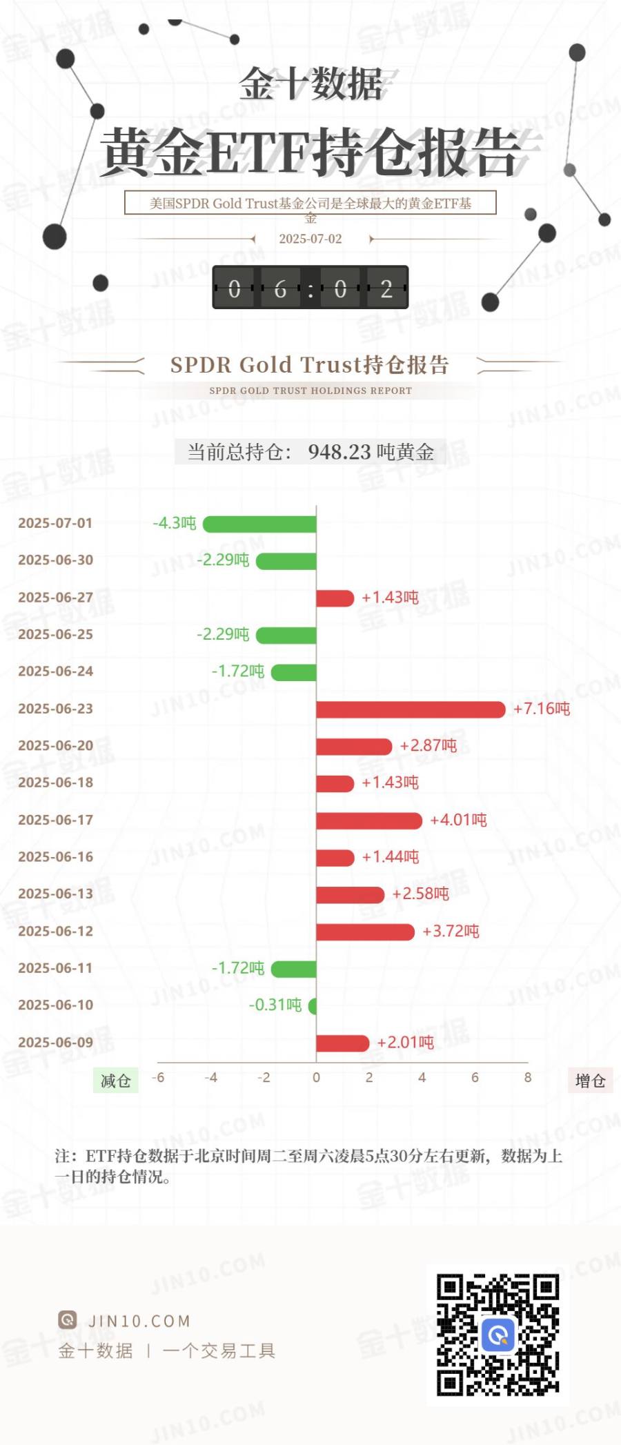 全球最大黄金ETF--SPDR Gold Trust持仓较上一交易日减少4.3吨,当前持仓量为948.23吨。 @ JIN10.COM 金十数据 | 一个交易工具 +2.58吨 2025-06-13 +3.72吨 2025-06-12 2025-06-11 -1.72吨 -0.31吨 2025-06-10 +2.01吨 2025-06-09 -2 0 6 8 -4 2 -6 4 减仓 增仓 注:ETF持仓数据于北京时间周二至周六凌晨5点30分左右更新,数据为上 一日的持仓情况。 ...