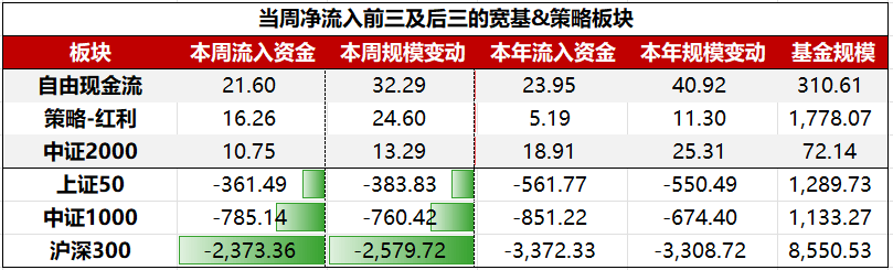 Market Overview - As of last weekend, the total scale of equity ETFs in the market reached 48,892.36 billion yuan, with a decrease of 2,906.25 billion yuan in total scale over the past week, and a reduction of 479.65 billion units, resulting in a net outflow of 3,137.53 billion yuan [1] Fund Inflow and Outflow Direction - In the broad-based and strategy ETF category, the top three inflow sectors were Free Cash Flow, Strategy-Dividend, and CSI 2000, while the top three outflow sectors were CSI 300, CSI 1000, and SSE 50 [3][4] - In the industry and thematic ETF category, the top five inflow sectors were Semiconductor Chips, Chemicals, Power Grid and Power Operations, Non-ferrous Metals, and Innovative Drugs, while the top five outflow sectors were Military Industry, State-owned Enterprises, Agriculture, Rare Earths, and Consumer Electronics [4][5] Key Focus Areas - The Chemical ETF (159870) has seen continuous net inflows for 16 days, with various sub-sectors receiving positive news. The prices of chemical futures have risen significantly, indicating a positive market outlook for chemical products [6] - Specific price increases include: - Butadiene rubber up by 4.69% - Ethylene glycol up by 4.51% - Styrene up by 4.07% [6] - The price of a key intermediate for disperse dyes has increased from 25,000 yuan per ton to 38,000 yuan, a rise of over 50% [6] - The domestic potassium chloride market is showing strength due to reduced domestic supply and increased import costs [6] - The Chemical ETF has attracted a total of 94.27 billion yuan in net inflows over the past 16 days, with an average daily net inflow of 5.89 billion yuan [6][9] New Energy Sector - The Innovative New Energy ETF (588830) has experienced three consecutive days of gains, driven by the announcement of plans to build 200 GW of solar capacity in the U.S. for data center power supply [10] - The expected demand for solar equipment is projected to be significant, with potential annual procurement needs of 60-70 GW, translating to substantial revenue and profit opportunities in the solar supply chain [10]
