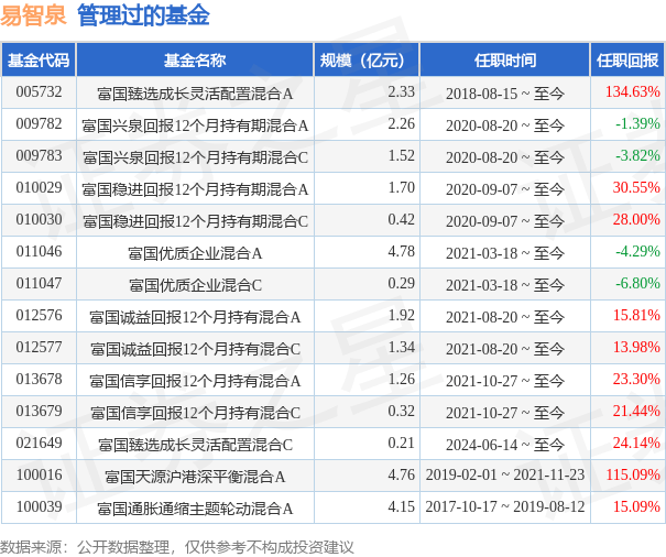 | ■金代码 | 基金名称 | 规模(亿元) | 任职时间 | 任职回报 | | --- | --- | --- | --- | --- | | 005732 | 富国臻选成长灵活配置混合A | 2.33 | 2018-08-15 ~ 至今 | 134.63% | | 009782 | 富国兴泉回报12个月持有期混合A | 2.26 | 2020-08-20 ~ 至今 | -1.39% | | 009783 | 富国兴泉回报12个月持有期混合C | 1.52 | 2020-08-20 ~ 至今 | -3.82% | | 010029 | 富国稳进回报12个月持有期混合A | 1.70 | 2020-09-07 ~ 至今 | 30.55% | | 010030 | 富国稳进回报12个月持有期混合C | 0.42 | 2020-09-07 ~ 至今 | 28.00% | | 011046 | 富国优质企业混合A | 4.78 | 2021-03-18 ~ 至今 | -4.29% | | 011047 | 富国优质企业混合C | 0.29 | 2021-03-18 ~ 至今 | -6.80% | | 012576 ...