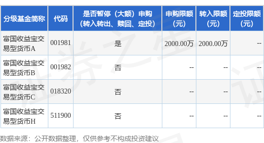 证券之星消息,8月14日富国基金管理有限公司发布《关于富国收益宝交易型货币市场基金(A类份 额)暂停大额申购、转换转入及定期定额投资业务的公告》。公告中提示,为了保证基金的平稳运作, 保护基金持有人的利益,自2025年8月18日起富国收益宝交易型货币市场基金(A类份额)暂停大额申 购、转换转入及定期定额投资业务,下属分级基金调整明细如下: | 分级基金简称 | 代码 | 是否暫停(大额)申购 | 申购限额 | 转入限额 | 定投限额 | | --- | --- | --- | --- | --- | --- | | | | (转入转出、赎回、定投) | (元) | (元) | (元) | | 富国收益宝交 易型货币A | 001981 | 를 | 2000.00万 2000.00万 | | | | 富国收益宝交 易型货币B | 001982 | KO | | | | | 富国收益宇交 易型货币C | 018320 | 篇 | | | | | 富国收益宝交 易型货币H | 511900 | KO | | | | 2、上表中限制相关业务的金额仅适用于本基金A类份额。本基金B类份额针对机构客户当日累计申购份 额上限 ...