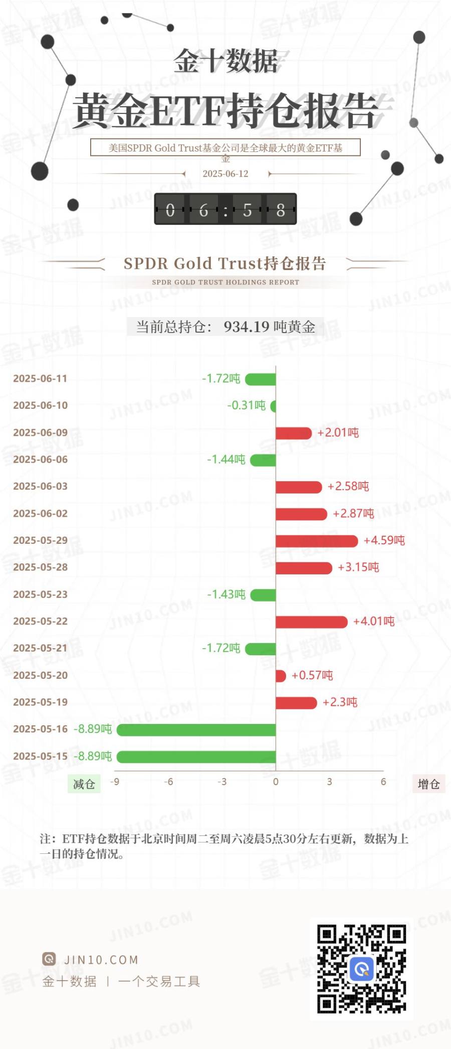 2025-05-22 +4.01吨 -1.72吨 2025-05-21 2025-05-20 +0.57吨 +2.3吨 2025-05-19 2025-05-16 -8.89吨 -6 -3 0 6 3 减仓 -9 增仓 全球最大黄金ETF--SPDR Gold Trust持仓较上日增加3.72吨,当前持仓量为937.91吨。 @ JIN10.COM 金十数据 | 一个交易工具 注:ETF持仓数据于北京时间周二至周六凌晨5点30分左右更新,数据为上 一日的持仓情况。 ...