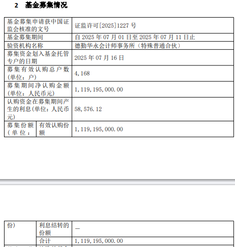 中国经济网北京7月17日讯 今日,富国基金发布富国中证港股通科技交易型开放式指数证券投资基 金基金合同生效公告。 | 基金募集申请获中国证 | 证监许可[2025]1227 号 | | --- | --- | | 监会核准的文号 | | | 基金募集期间 | 自 2025年07月01日至2025年07月11日止 | | 验资机构名称 | 德勤华永会计师事务所(特殊普通合伙) | | 募集资金划入基金托管 | 2025 年 07月16日 | | 专户的日期 | | | 募集有效认购总户数 | 4.168 | | (单位:户) | | | 募集期间净认购金额 | 1.119.195.000.00 | | (单位:人民币元) | | | 认购资金在募集期间产 生的利息(单位:人民币 | 58, 576. 12 | | 元) | | | 募集份额 有效认购份 | 1,119,195,000.00 | | (单位: 器则 | | | 份) | 利息结转的 | | | --- | --- | --- | | | 份额 | | | | 合计 | 1, 119, 195, 000. 00 | (责任编辑:康博) 募集期间净认 ...
