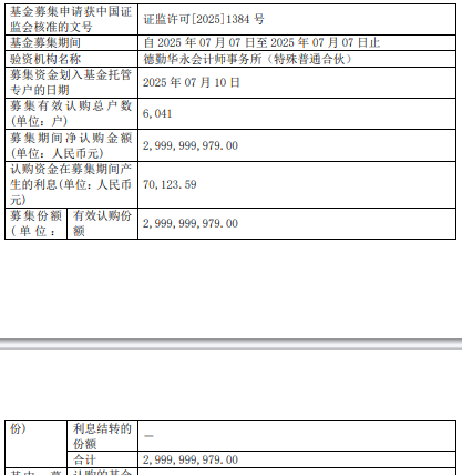 中国经济网北京7月11日讯 今日,富国基金发布富国中证AAA科技创新公司债交易型开放式指数证 券投资基金基金合同生效公告。 募集期间净认购金额2,999,999,979.00元,认购资金在募集期间产生的利息70,123.59元,募集份额合 计2,999,999,979.00份。 基金经理张洋曾任招商银行总行交易员,招商银行总行投资经理,平安银行总行投资经理;自2020 年3月加入富国基金管理有限公司,现任富国基金固定收益投资部固定收益基金经理。 | 基金募集申请获中国证 | | 证监许可[2025]1384 号 | | --- | --- | --- | | 监会核准的文号 | | | | 基金募集期间 | | 自2025年07月07日至2025年07月07日止 | | 验资机构名称 | | 德勤华永会计师事务所(特殊普通合伙) | | 募集资金划入基金托管 | | 2025年07月10日 | | 专户的日期 | | | | 募集有效认购总户数 | | 6.041 | | (单位:户) | | | | 募集期间净认购金额 | | 2.999.999.979.00 | | (单位:人民币元) | | | | 认 ...