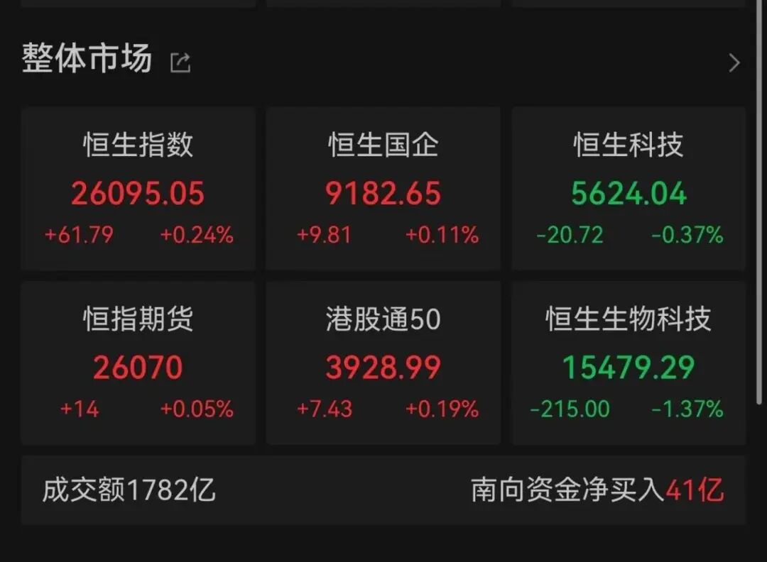 【导读】港股午盘回升,恒生科技指数收跌,重型机械股集体走强 今日港股三大指数表现不一。恒生指数报收于26095点,大型科技股走势分化、部分车企跌幅靠前,拖累恒生科技指数最终收跌。 港股三大指数走势分化 12月2日,港股三大指数早盘高开回落,午盘再度回升。截至收盘,恒生指数、恒生国企指数分别上涨0.24%、0.11%,恒生科技指数下跌0.37%。南向资 金今日净流入为41亿港元。 首先关注大型科技股走势,美团下跌超3%,阿里巴巴、小米、网易收涨,走势出现分化。 | 整体市场 △ | | | | --- | --- | --- | | 恒生指数 | 恒生国企 | 恒生科技 | | 26095.05 | 9182.65 | 5624.04 | | +61.79 +0.24% | +9.81 +0.11% | -20.72 -0.37% | | 恒指期货 | 港股通50 | 恒生生物科技 | | 26070 | 3928.99 | 15479.29 | | +14 +0.05% | +7.43 +0.19% -215.00 -1.37% | | | 成交额1782亿 | | 南向资金净买入41亿 | 保险股回暖 中国 ...