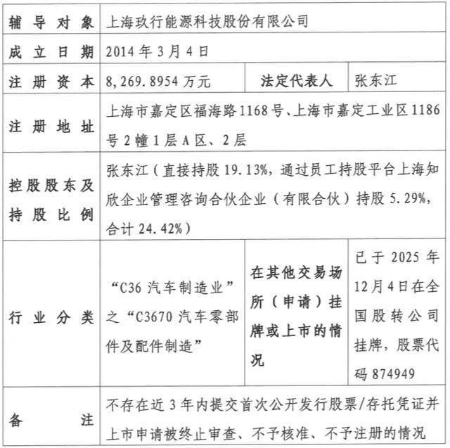 | 辅导对象 | 上海玖行能源科技股份有限公司 | | --- | --- | | 成立日期 | 2014年3月4日 | | 注册资本 | 8,269.8954 万元 法定代表人 张东江 | | 注册地址 | 上海市嘉定区福海路1168号、上海市嘉定工业区1186 | | | 号2幢1层A区、2层 | | 控股股东及 | 张东江(直接持股19.13%,通过员工持股平台上海知 欣企业管理咨询合伙企业(有限合伙)持股 5.29%, | | 持 股 比 例 | | | | 合计 24.42%) | | 行业分类 | 已于 2025年 在其他交易场 所(申请)挂 | | | "C36 汽车制造业" 12月4日在全 | | | 之"C3670 汽车零部 国股转公司 | | | 牌或上市的情 | | | 挂牌,股票代 件及配件制造" 况 | | | 码 874949 | | 备 注 | 不存在近3年内提交首次公开发行股票/存托凭证并 | | | 上市申请被终止审查、不予核准、个于注册的情况 | 瑞财经 严明会 近日,上海玖行能源科技股份有限公司(以下简称:玖行能源)在上海证监局完成IPO 辅导备案,拟北交所IPO,辅导机 ...