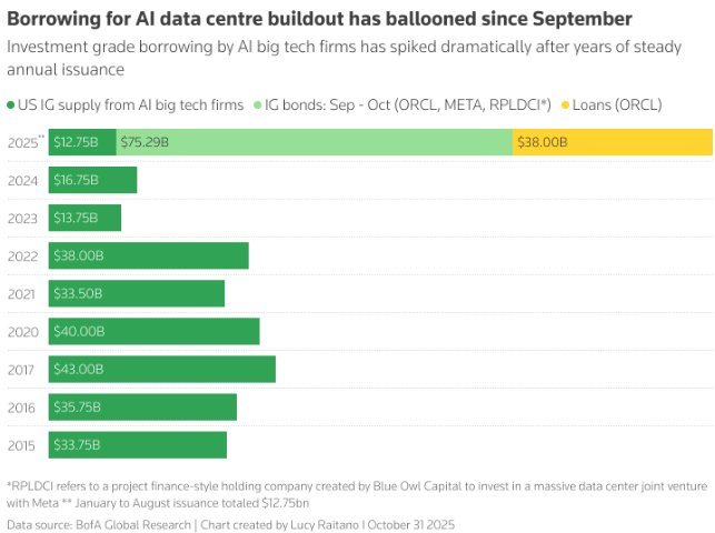 人工智能热潮推动全球股市创下历史新高,但这股热潮现在越来越多地依靠复杂的债务融资,因为拥有庞大算力的数据中心需要巨额资金投 入,其财务可持续性引起投资者的关注,市场也开始激辩AI热潮是否存在泡沫。 支持者表示,与以往的市场狂热(例如20世纪90年代末的互联网泡沫)不同,这次的市场狂热是由那些盈利能力强、资金雄厚且拥有无可辩驳的 商业理由的公司推动的。然而,包括英国央行在内的一些观察人士表示,金融体系中存在一些风险点,这些风险点集中在不透明、难以交易 且流动性差的资产领域。 因此,本轮AI热潮中的债务融资也至关重要。但债务融资透明性往往不如股票,能够以直观的股价变动反映,为了更直观地观察目前AI债券 融资的情况,本文总结囊括了目前该市场的五大特点。 1)人工智能投资级借贷激增 美国银行的数据显示,仅在9月和10月,专注于人工智能的大型科技公司就发行了750亿美元的美国投资级债券,是2015年至2024年间该行业 平均每年发行量320亿美元的两倍多。债券发行包括来自Meta(META.US)的300亿美元和来自甲骨文(ORCL.US)的180亿美元。此外,谷歌母公 司Alphabet(GOOGL.US)周一宣布了 ...