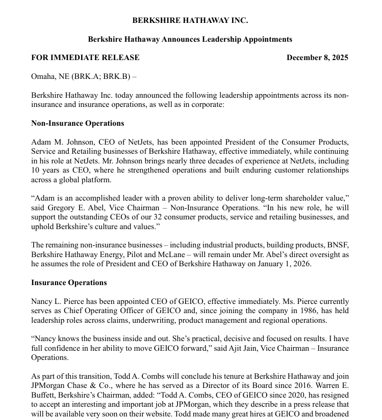 Berkshire Hathaway Announces Leadership Appointments 北京时间12月8日晚间,知名投资人沃伦·巴菲特旗下伯克希尔·哈撒韦(下称"伯克希尔") 宣布多项高层人事变动,为巴菲特的正式交棒铺路。 BERKSHIRE HATHAWAY INC. FOR IMMEDIATE RELEASE December 8, 2025 Omaha, NE (BRK.A; BRK.B) - Berkshire Hathaway Inc. today announced the following leadership appointments across its non- insurance and insurance operations, as well as in corporate: Non-Insurance Operations Adam M. Johnson, CEO of NetJets, has been appointed President of the Consumer Products, Service and Retailing businesses ...