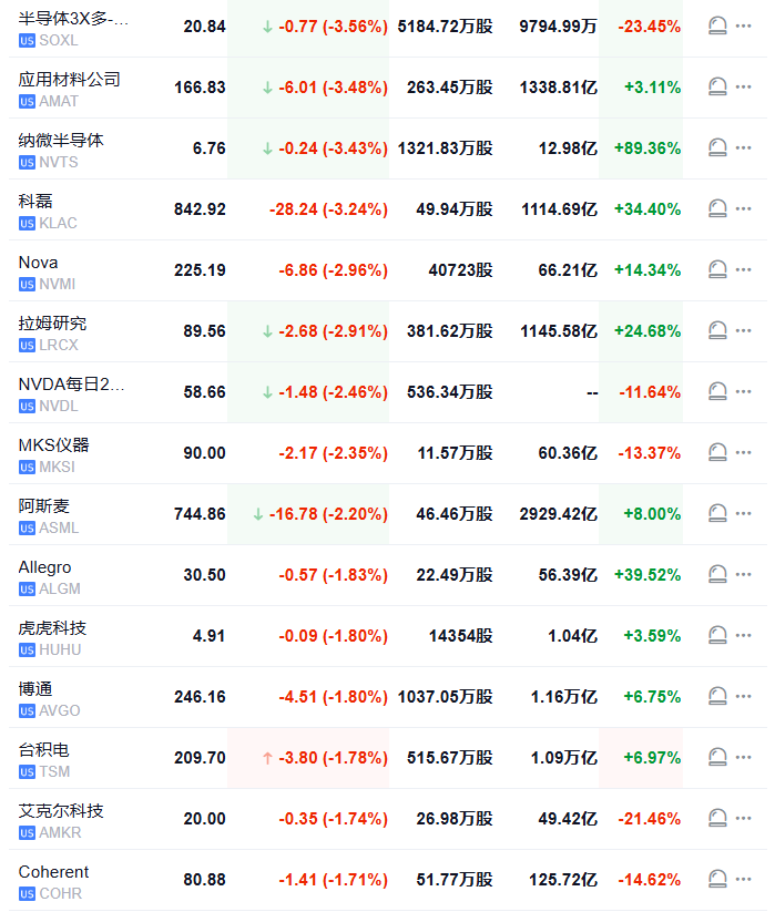 芯片概念股多数下跌,应用材料跌3.5%,纳微半导体跌3.4%,科磊跌3.2%,Nova跌2.9%,拉姆研究跌 2.9%,英伟达两倍做多ETF跌2.4%,万机仪器跌2.3%,阿斯麦ADR跌2.2%,博通、台积电ADR、相干 公司至多跌1.8%,英伟达也跌超1.3%。 | 半导体3X多 --- | 20.84 | ↓ -0.77 (-3.56%) 5184.72万股 | | 9794.99万 | -23.45% | ( ) ... | | --- | --- | --- | --- | --- | --- | --- | | us SOXL | | | | | | | | 应用材料公司 | 166.83 | J -6.01 (-3.48%) | 263.45万股 | 1338.81亿 | +3.11% | 를 … | | us AMAT | | | | | | | | 纳微半导体 | 6.76 | ↓ - 0.24 (-3.43%) 1321.83万股 | | 12.98亿 | +89.36% | ( ) ... | | us NVTS | | | | | | | | 科器 | 842.92 | -28.24 ( ...