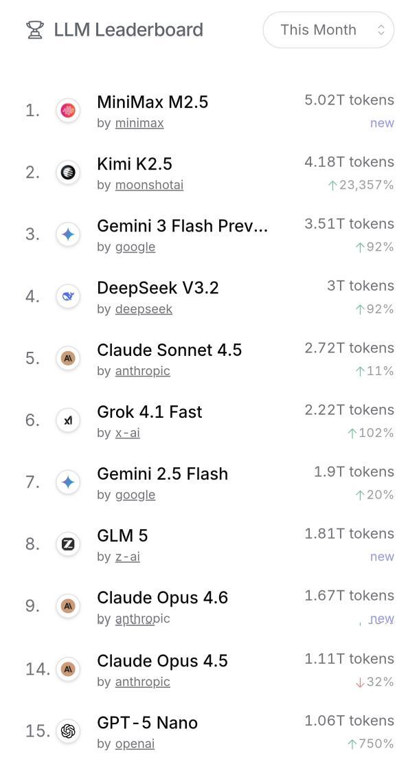 最近AI圈的重磅炸点,莫过于国产大模型在全球赛场的首次"超车"。 OpenRouter权威数据实打实摆着: 2月9-15日,中国模型Token调用量4.12万亿,首超美国的2.94万亿;一周后再冲高至5.16万亿,三周大涨127%,而美国模型却跌至2.7万亿。 更亮眼的是,发布仅两周的MiniMaxM2.5,直接以4.55万亿Token调用量拿下OpenRouter单月冠军。 这不是偶然的昙花一现,而是国产大模型从技术跟跑到全面爆发的必然结果。 | | LLM Leaderboard | This Month | | --- | --- | --- | | | MiniMax M2.5 | 5.02T tokens | | | by minimax | new | | 2. | Kimi K2.5 | 4.18T tokens | | | by moonshotai | 123,357% | | 3. | Gemini 3 Flash Prev ... | 3.51T tokens | | | by google | 192% | | | DeepSeek V3.2 | 3T tokens | | | by ...