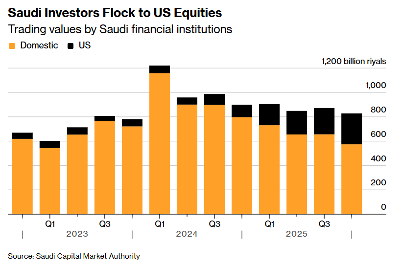 一项政府统计数据显示,在2025年全年,沙特阿拉伯投资者们大幅增加了他们在美国股票市场的交易规模,将资金 从一个跻身全球表现最差股票市场之列的国内市场重新配置出去。 根据沙特资本市场管理局的数据,第四季度,沙特金融机构们对于美国股票资产的交易额升至约2540亿里亚尔(约680 亿美元),较上年同期水平可谓翻番。第四季度,在沙特王国境外进行的股票交易几乎全部集中于美国股票市场。 与此同时,沙特证券交易所的本地交易活动出现意外萎缩。王国内的股票总交易额从2024年初的逾1.1万亿里亚尔, 大幅降至2025年末的约5740亿里亚尔。 即便本地投资者正在大举撤离国内股票市场,沙特监管机构仍在加大力度吸引外国资本。有关部门近期已向更广泛 范围的国际投资者开放市场,并正在考虑调整交易规则,允许外国投资者持有沙特上市公司的多数股权。有分析师 表示,此举可能释放出数十亿美元的被动资金流入。 沙特监管机构还鼓励企业在IPO中向散户投资者们分配更大比例的股份,以提升本地投资者们参与度。一些投资银行 对此提出反对,认为该政策存在将股份强行推向一个需求仍不均衡的群体的重大风险,同时会限制外国机构投资者 的配售份额。 沙特资金为何青睐 ...