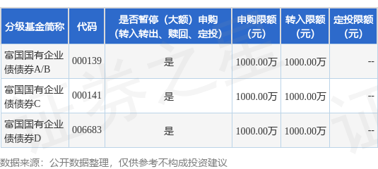 以上内容为证券之星据公开信息整理,由AI算法生成(网信算备310104345710301240019号),不构成 投资建议。 证券之星消息,8月6日富国基金管理有限公司发布《关于富国国有企业债债券型证券投资基金(A、C 类份额)暂停大额申购、转换转入及定期定额投资业务的公告》。公告中提示,为了保证基金的平稳运 作,保护基金持有人的利益,自2025年8月6日起富国国有企业债债券型证券投资基金(A、C类份额) 暂停大额申购、转换转入及定期定额投资业务,下属分级基金调整明细如下: | 分级基金简称 | 代码 | 是否暂停(大额)申购 | 申购限额 | 转入限额 定投限额 | | --- | --- | --- | --- | --- | | | | (转入转出、赎回、定投) | (元) (元) | (元) | | 富国国有企业 债债券A/B | 000139 | 를 | 1000.00万 1000.00万 | | | 富国国有企业 债债券C | 000141 | 를 | 1000.00万 1000.00万 | | | 富国国有企业 债债券D | 006683 | 를 | 1000.00万 1000.00万 | | ...