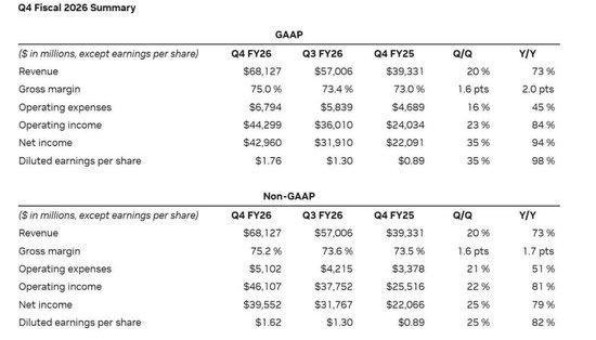 作者:中信证券前瞻研究团队(陈俊云/高飞翔/许英博/俞好好) 来源:市场资讯 1、公司当季营收681亿美元(同比+73%,环比+20%),好于市场670亿美元的一致预期,好于公司此 前650亿美元的指引预期。 (b)12月与Groq签订非独家许可协议,以加速全球范围内的 AI 推理。 2、公司当季GAAP毛利率75.0%,Non-GAAP毛利率75.2%,好于公司此前74.8%的指引,符合市场 75.0%的一致预期。 3、公司当季GAAP净利润429.6亿美元(同比+94%,环比+35%),对应EPS为1.76美元。公司当季Non- GAAP净利润395.5亿美元(同比+79%,环比+25%),对应Non-GAAP EPS为1.62美元,好于市场380亿 美元Non-GAAP净利润的一致预期。 4、业绩指引:(a)公司预计FY27Q1营收约780亿美元(±2%),显著好于市场733亿美元的一致预 期。该收入指引并未包含中国区的收入假设。(b)公司预计FY27Q1毛利率为75%(上下50个基点), 好于市场74.6%的预期。 【数据中心】 1、公司当季营收623亿美元(同比+75%,环比+22%),主要得益于 ...