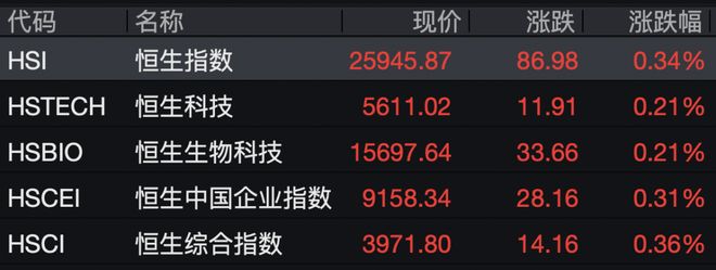 12月1日,香港恒生指数高开0.34%,恒生科技指数涨0.21%。 热门科网股 多数上涨 ,阿里巴巴、腾讯控股、小米集团微涨;美团跌超2%。 | 代码 | 名称 | 现价 | 涨跌 | 涨跌幅 | | --- | --- | --- | --- | --- | | HSI | 恒生指数 | 25945.87 | 86.98 | 0.34% | | HSTECH | 恒生科技 | 5611.02 | 11.91 | 0.21% | | HSBIO | 恒生生物科技 | 15697.64 | 33.66 | 0.21% | | HSCEI | 恒生中国企业指数 | 9158.34 | 28.16 | 0.31% | | HSCI | 恒生综合指数 | 3971.80 | 14.16 | 0.36% | 新城发展涨逾6%,中国中冶涨逾5%,赛力斯、猫眼娱乐涨逾4%。 | 人气榜 | 涨幅榜 | 跌幅榜 | 成交额榜 | | --- | --- | --- | --- | | 名称 | | 现价 | 涨跌幅 | | 美团-W | | 100.100 | -2.34% | | 3690.HK | | | | | 阿里巴 ...