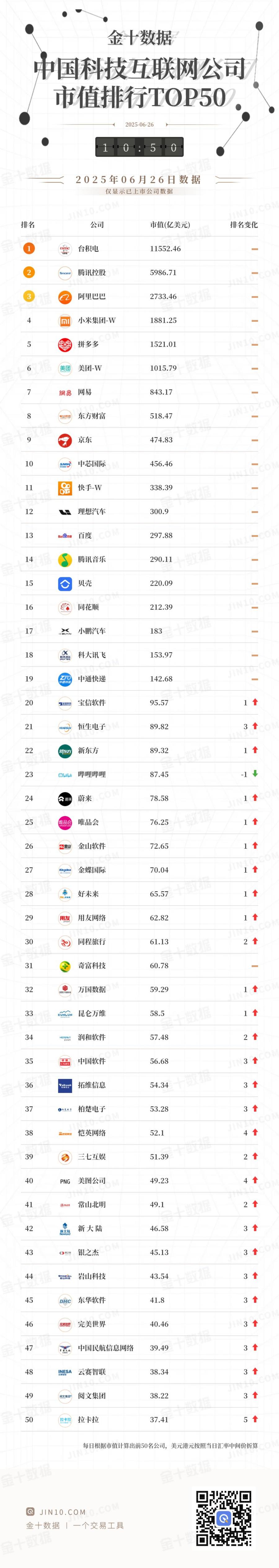 金十图示:2025年06月26日(周四)中国科技互联网公司市值排名TOP 50一览