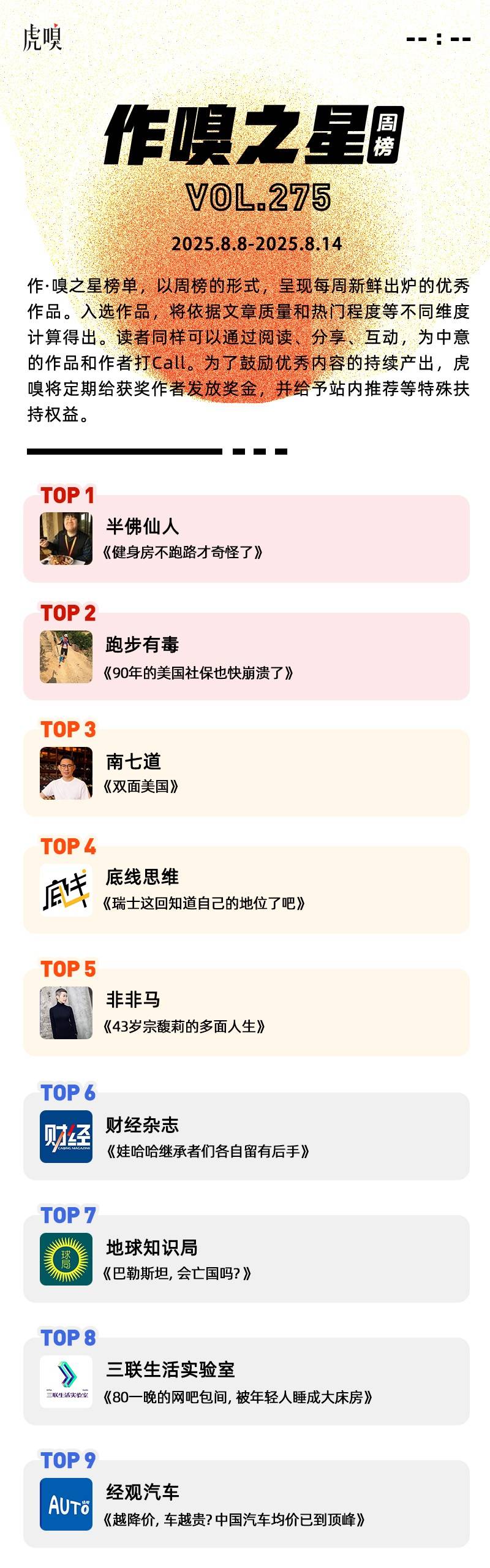 作·嗅之星榜单,以周榜的形式,呈现每周新鲜出炉的优秀作品。2025年8月8日~2025年8月14日,虎嗅第275期, 作·嗅之星的获奖文章分别是: 以下为榜单详情: UJIF HH THIF H IJU 嗅将定期给获奖作者发放奖金,并给予站内推荐等特殊扶 持权益。 TOP 1 半佛仙人 《健身房不跑路才奇怪了》 TOP 2 跑步有毒 《90年的美国社保也快崩溃了》 TOP 1:《健身房不跑路才奇怪了》作者:半佛仙人 TOP 2:《90年的美国社保也快崩溃了》作者:跑步有毒 TOP 3:《双面美国》作者:南七道 TOP 4:《瑞士这回知道自己的地位了吧》作者:底线思维 TOP 5:《43岁宗馥莉的多面人生》作者:非非马 TOP 6:《娃哈哈继承者们各自留有后手》作者:财经杂志 TOP 7:《巴勒斯坦,会亡国吗?》作者:地球知识局 TOP 8:《80一晚的网吧包间,被年轻人睡成大床房》作者:三联生活实验室 TOP 9:《越降价,车越贵?中国汽车均价已到顶峰》作者:经观汽车 非非马 TOP 3 南七道 《双面美国》 TOP 4 店开 底线思维 《瑞士这回知道自己的地位了吧》 TOP 5 《43岁宗馥莉的多面人生》 ...