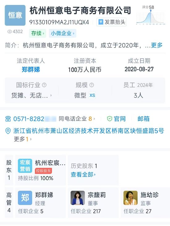 Group 1 - Hangzhou Hengyi E-commerce Co., Ltd. was established on August 27, 2020, with a registered capital of 1 million RMB and currently has 3 employees [2] - The company is now the operating entity for the new "Wahaha flagship store" on Tmall, which has recently undergone a change in ownership [5] - The previous Tmall store was associated with Tongyuan Kang E-commerce (Hangzhou) Co., Ltd., which is controlled by Sanjie Investment Group Co., Ltd. [5] Group 2 - The new ownership structure indicates that the flagship store is now under the control of Zong Fuli through Hangzhou Hongchen Marketing Co., Ltd. [5] - The previous store's name change raised concerns among consumers regarding the potential sale of the Tmall account [5] - As of the latest inquiry, there has been no response from Wahaha regarding the changes in store ownership [5]