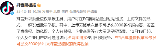 12月18日,抖音在微博发文宣布,升级批量侵权举报工具,用户可在PC端网站通过粘贴链接、上传文 件的形式,一键发起批量举报。 责任编辑:李昂 12月18日,抖音在微博发文宣布,升级批量侵权举报工具,用户可在PC端网站通过粘贴链接、上传文 件的形式,一键发起批量举报。 其中,上传表格单次最多可提交2000条举报内容,覆盖了肖像权、隐私权、个人名誉权、企业商誉等八 大常见侵权场景。12月18日起,个人及企业用户均可通过访问http://t.cn/AXUNuKfn网页链接使用相关 服务。 其中,上传表格单次最多可提交2000条举报内容,覆盖了肖像权、隐私权、个人名誉权、企业商誉等八 大常见侵权场景。12月18日起,个人及企业用户均可通过访问http://t.cn/AXUNuKfn网页链接使用相关 服务。 责任编辑:李昂 ...