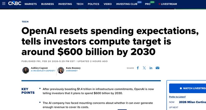 Core Viewpoint - OpenAI is significantly reducing its capital expenditure expectations, now targeting a total computing expenditure of approximately $600 billion by 2030, down from the previously stated $1.4 trillion commitment by CEO Sam Altman [1][3][6] Group 1: Financial Projections - The company anticipates total revenue exceeding $280 billion by 2030, a substantial increase from $13.1 billion in 2025, with contributions from consumer and enterprise businesses expected to be roughly equal [4] - OpenAI's adjusted gross margin is projected to decline to 33% by 2025, with the company expecting to achieve positive cash flow by 2030 [5][8] Group 2: User Growth and Competition - ChatGPT currently supports over 900 million weekly active users, an increase from 800 million in October of the previous year [9] - Despite a temporary slowdown in user growth last fall, both weekly and daily active user numbers have rebounded to historical highs [10] - OpenAI has entered a "red alert" state to focus on improving chatbot functionalities in response to competitive pressures from Google and Anthropic [11] Group 3: Financing and Valuation - OpenAI is nearing the completion of a new financing round, aiming to raise over $100 billion, with a pre-financing valuation of approximately $830 billion, potentially making it one of the largest private financings in history [13][14] - Strategic investors in this financing round include Nvidia, which may invest up to $30 billion, as well as SoftBank and Amazon [15] - The company initiated this substantial financing due to anticipated surges in AI operational and training costs, projected to reach around $450 billion from 2025 to 2030 [15]