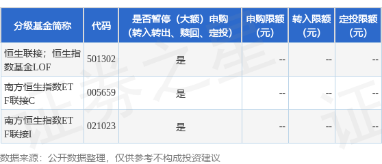 证券之星消息,10月24日南方基金管理股份有限公司发布《关于南方恒生交易型开放式指数证券投资基 金联接基金2025年10月29日暂停申购、赎回和定投业务的公告》。公告中提示,为2025年10月29日(香 港重阳节)为非港股通交易日,本基金暂停申购、赎回及定投业务,自2025年10月29日起南方恒生交易 型开放式指数证券投资基金联接基金2025年10月29日暂停申购、赎回和定投业务,下属分级基金调整明 细如下: 以上内容为证券之星据公开信息整理,由AI算法生成(网信算备310104345710301240019号),不构成 投资建议。 | 分级基金简称 | 代码 | | 是否暫停(大额)申购 (转入转出、赎回、定投) | 申购限额 | 转入限额 定投限额 | (元) | | --- | --- | --- | --- | --- | --- | --- | | | | | | (元) | (元) | | | 恒生联接;恒生指 | 501302 | 를 | | | | | | 数其金LOF | | | | | | | | 南方恒生指数ET | 005659 | 를 | | | | | | F联接C | | | | ...