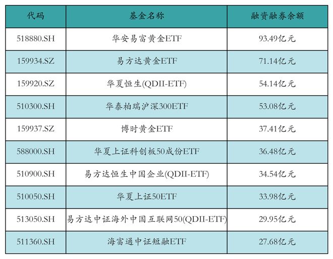 市场概况 4月29日两市ETF两融余额为1030.92亿元,较前一交易日增加5.07亿元。其中融资余额为983.37亿元, 较前一交易日增加5.1亿元;融券余额为47.55亿元,较前一交易日减少386.58万元。 分市场来看,沪市ETF两融余额为679.48亿元,较前一交易日增加5.11亿元。其中融资余额为638.82亿 元,较前一交易日增加5.15亿元;融券余额为40.67亿元,较前一交易日减少379.25万元。深市ETF两融 余额为351.44亿元,较前一交易日减少453.75万元。其中融资余额为344.55亿元,较前一交易日减少 446.43万元;融券余额为6.89亿元,较前一交易日减少7.32万元。 ETF融资融券余额 4月29日ETF两融余额前三位分别为:华安易富黄金ETF(87.81亿元)、易方达黄金ETF(70.57亿元)和华夏 恒生(QDII-ETF)(54.06亿元),前10具体见下表: | 代码 | 基金名称 | 融资融券余额 | | --- | --- | --- | | 518880.SH | 华安易富黄金ETF | 87.81亿元 | | 159934.SZ | 易方达黄金ETF | ...