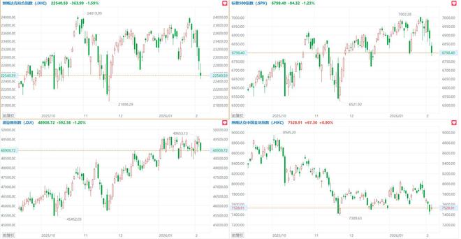 记者丨曾静娇 庞华玮 编辑丨江佩霞 美东时间周四,美股三大指数集体跌超1%,道指跌近600点,纳指跌超360点,科技股普跌,中概股逆势飘红;国际金银价格刷新日低,现货 白银重挫近20%;国际油价集体飘绿,比特币跌至6.4万美元。 | 道琼斯工业 | 纳斯达克指数 | 标普500 | | --- | --- | --- | | 48908.72 | 22540.59 | 6798.40 | | -592.58 -1.20% -363.99 -1.59% -84.32 -1.23% | | | | 美国科技七巨头 | 中概科技龙头 | 中国金龙 | | 63266.41 | 4067.33 | 7528.91 | | -1132.95 -1.76% | | -18.30 -0.45% +67.30 +0.90% | 科技股普跌,甲骨文跌超7%,微软跌近5%,亚马逊跌超4%,特斯拉跌逾2%,英伟达跌超1%。 盘后,亚马逊跌幅扩大至10%,其公布的最新财报显示,第四财季净利润211.9亿美元,同比增长6% 芯片股涨跌互现,ARM涨超5%,应用材料涨逾2%,科天半导体涨超1%,拉姆研究涨逾1%。高通跌超8%,西部数据、 ...