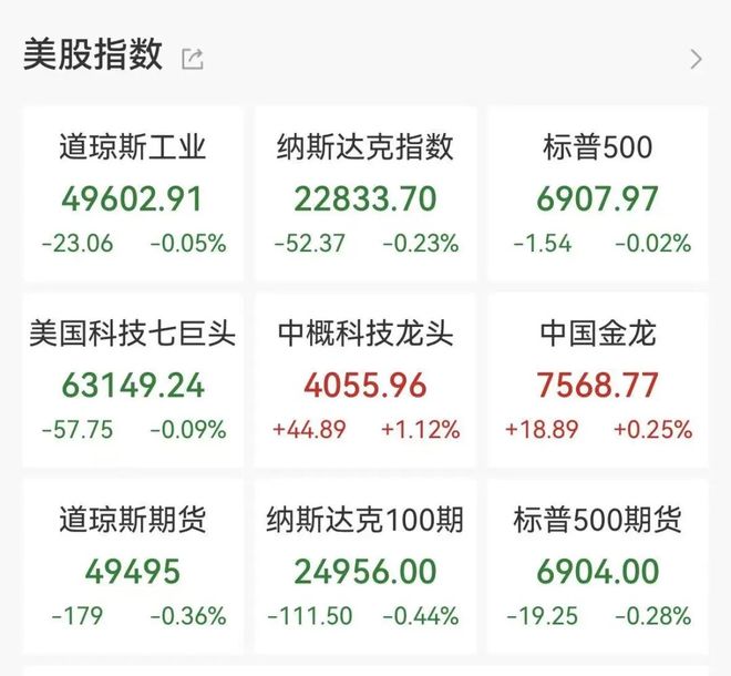 记者丨黎雨桐 李益文 编辑丨倪新平 美国贸易政策前景不明令市场情绪承压,23日,美股三大指数集体低开,截至北京时间22:40,纳指跌 0.23%,道指跌0.05%,标普500指数跌0.02%。 | 美股指数 它 | | | | --- | --- | --- | | 道琼斯工业 | 纳斯达克指数 | 标普500 | | 49602.91 | 22833.70 | 6907.97 | | -23.06 -0.05% -52.37 -0.23% -1.54 -0.02% | | | | 美国科技七巨头 中概科技龙头 | | 中国金龙 | | 63149.24 | 4055.96 | 7568.77 | | -57.75 -0.09% +44.89 +1.12% +18.89 +0.25% | | | | 道琼斯期货 | 纳斯达克100期 | 标普500期货 | | 49495 | 24956.00 | 6904.00 | | -179 -0.36% -111.50 -0.44% -19.25 -0.28% | | | 科技股多数下跌,特斯拉跌超2%,亚马逊、微软跌近2%,脸书跌近1%。 欧洲减肥药巨头诺和诺德大跌 ...
