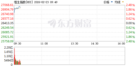 | | | 恒生指数[H2I] 2026-02-23 09:49 | | | 价格 | ■ 均线 | | | | --- | --- | --- | --- | --- | --- | --- | --- | --- | | 27068.61 | | | | | | | | 2.48 % | | 26904.79 | A / - | | | | | | | 1.86 % | | 26740.98 | | | | | | | | 1.24 % | | 26577.16 | | | | | | | | 0.62 % | | 26413.35 | | | | | | | | 0.00 % | | 26249.54 | | | | | | | | 0.62 % | | 26085.72 | | | | | | | | 1.24 % | | 25921.91 | | | | | | | | 1.86 % | | 25758.09 | | | | | | | | 2.48 % | | 09:30 | | 11:00 | 13:30 | 14:30 | | | 16:00 | | | 2.20亿 | | | | | | | ...