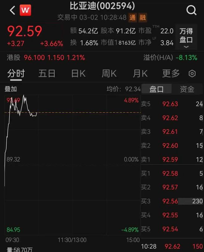 记者|黄琳 编辑|瑜见 3月2日,比亚迪(002594.SZ)开盘即上涨,股价盘中涨幅一度逼近5%,领涨汽车整车板块;比亚迪股 份(01211.HK)股价盘中一度涨超3%,在港股逆势上涨。 | < W | 比亚迪(002594) | | | | | --- | --- | --- | --- | --- | | | 交易中 03-02 10:28:48 通 融 | | | | | 92.59 | 额 54.2亿 股本 91.2亿 市盈 22.0 | | | 万得 | | +3.27 +3.66% 央 1.68% 中值18163亿 市净 | 3.84 | | | 盘口 | | 港股 96.100 1.150 1.21% | 溢价(H/A) -8.13% | | | | | 分时 五日 日K | 周K 月K 更多 ◎ | | | | | 叠加 | 均价:92.34 盘口 | | | 资金 | | | 4.89% 卖5 | | 92.63 | 24 | | | | 524 | 92.62 | 8 | | | | 23 | 92.61 | 7 | | | | 22 | 92.60 | 15 | | 89.32 | 0 ...