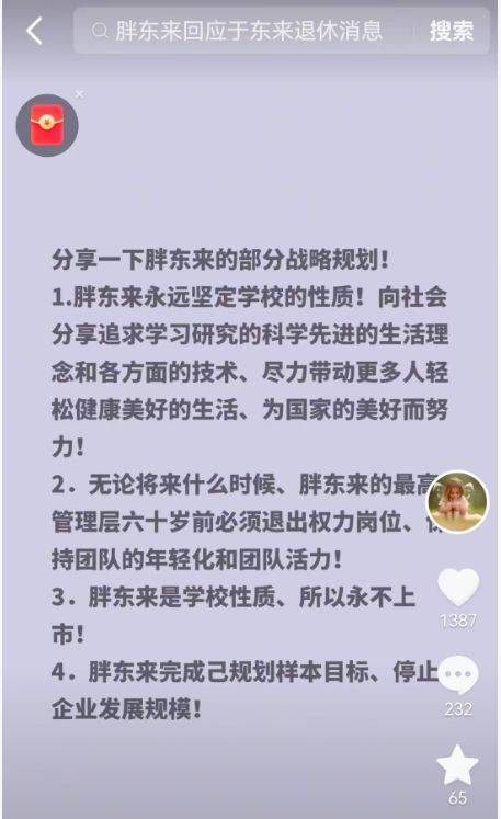 胖东来永远坚定学校的性质,向社会分享追求学习研究的科学先进的生活理念和各方面的技术,尽力带 动更多人轻松健康美好的生活,为国家的美好而努力;无论将来什么时候,胖东来的最高管理层六十岁 前必须退出权力岗位,保持团队的年轻化和团队活力;胖东来是学校性质,所以永不上市;胖东来完成 己规划样本目标,停止企业发展规模。 2月12日,胖东来创始人于东来在社交平台分享胖东来的部分战略规划,当中包括: (抖音) ...
