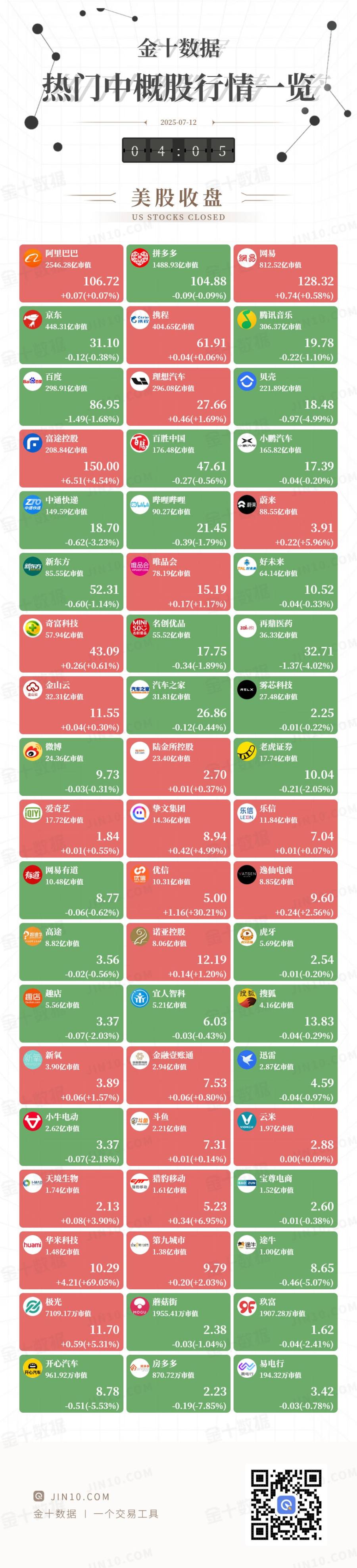 金十图示:2025年07月14日(周一)热门中概股行情一览(美股收盘)