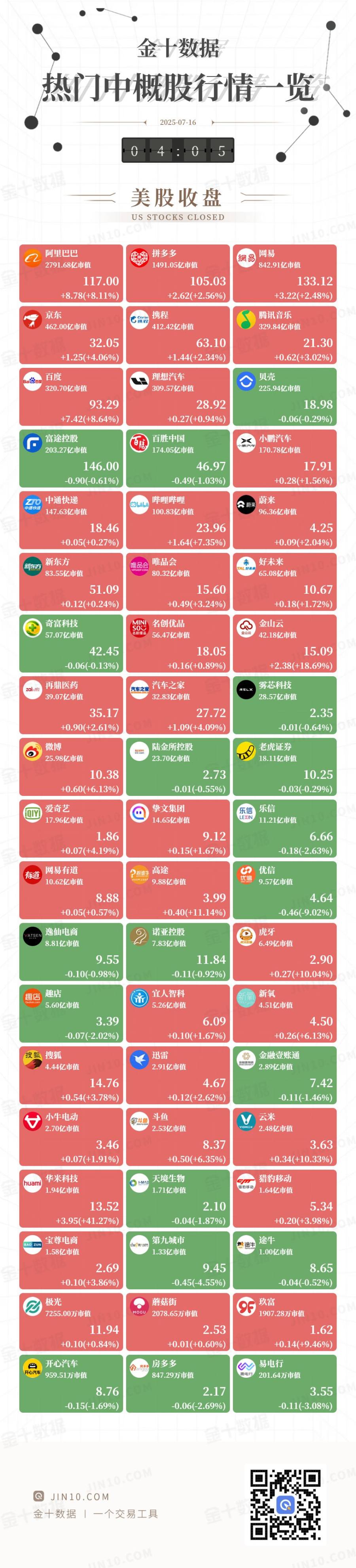 金十图示:2025年07月15日(周二)热门中概股行情一览(美股收盘)