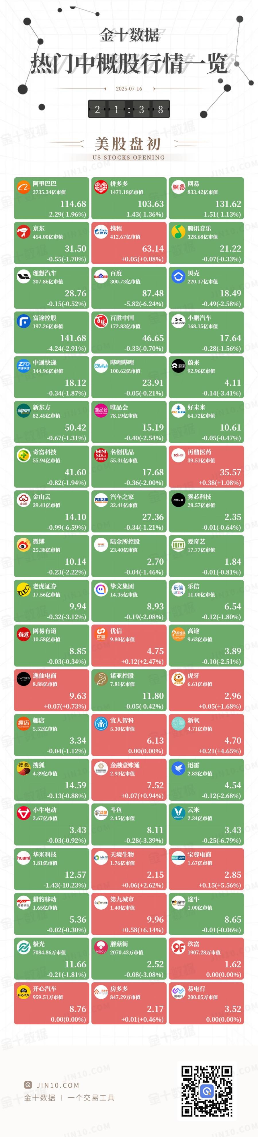 金十图示:2025年07月16日(周三)热门中概股行情一览(美股盘初)