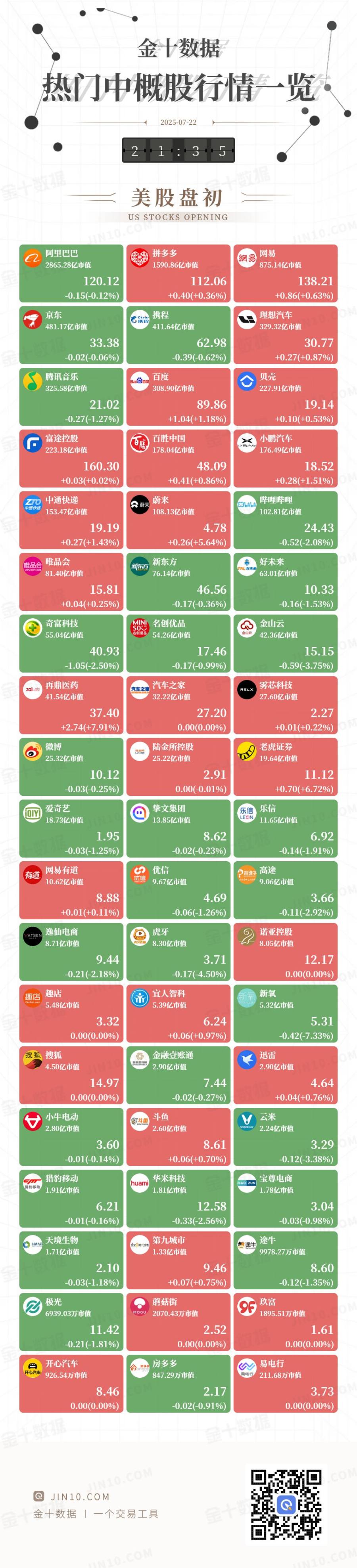 金十图示:2025年07月22日(周二)热门中概股行情一览(美股盘初)