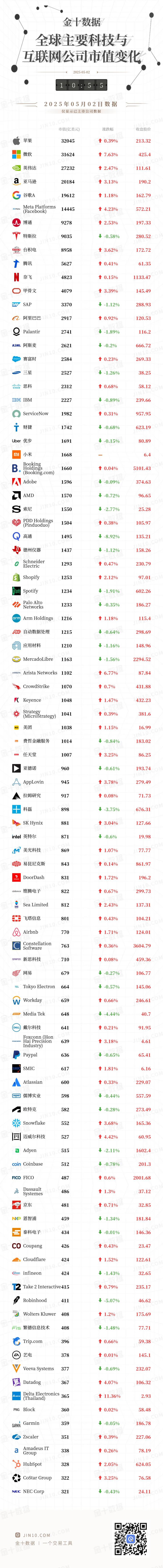 金十图示:2025年05月02日(周五)全球主要科技与互联网公司市值变化