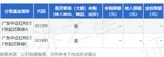 以上内容为证券之星据公开信息整理,由AI算法生成(网信算备310104345710301240019号),不构成 投资建议。 | 分级基金简称 | 代码 | 是否暂停(大额)申购 | 申购限额 转入限额 定投限额 | | --- | --- | --- | --- | | | | (转入转出、赎回、定投) | (元) (元) (元) | | 广发中证红利ET F发起式联接A | 021399 | 를 | | | 广发中证红利ET F发起式联接C | 021400 | 투 | | 证券之星消息,9月5日广发基金管理有限公司发布《关于广发中证红利交易型开放式指数证券投资基金 发起式联接基金暂停机构投资者大额申购(含转换转入、定期定额和不定额投资)业务的公告》。公告 中提示,为保护基金份额持有人利益,自2025年9月5日起广发中证红利交易型开放式指数证券投资基金 发起式联接基金暂停机构投资者大额申购(含转换转入、定期定额和不定额投资)业务,申购、转换转 入上限金额为10.0万元,下属分级基金调整明细如下: ...