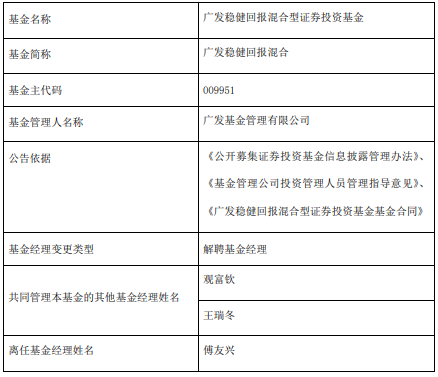 | 基金名称 | 广发稳健回报混合型证券投资基金 | | --- | --- | | 基金简称 | 广发稳健回报混合 | | 基金主代码 | 009951 | | 基金管理人名称 | 广发基金管理有限公司 | | 公告依据 | 《公开募集证券投资基金信息技露管理办法》、 | | | 《基金管理公司投资管理人员管理指导意见》、 | | | 《广发稳健回报混合型证券投资基金基金合同》 | | 基金经理变更类型 | 解聘基金经理 | | 共同管理本基金的其他基金经理姓名 | 观富饮 | | | 王瑞冬 | | 离任基金经理姓名 | 傅友兴 | (责任编辑:康博) 广发稳健回报混合A/C成立于2020年8月17日,截至2025年9月2日,其今年来收益率为10.68%、 10.38%,成立来收益率为-12.31%、-14.06%,累计净值为0.8769元、0.8594元。 中国经济网北京9月3日讯 今日,广发基金公告,傅友兴离任广发稳健回报混合。 傅友兴2002年2月至2006年3月先后任天同基金管理有限公司研究员、基金经理助理、投委会秘书, 广发基金管理有限公司研究发展部研究员、基金经理助理、研究发展部副总经理、研究 ...