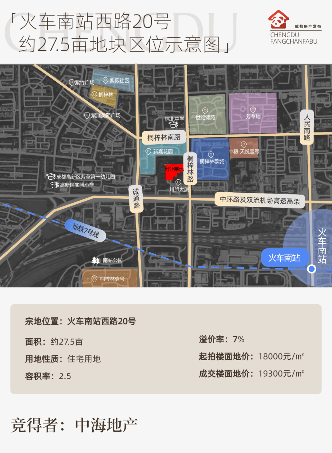 今天,桐梓林27.5亩地块走上拍卖席,被中海以成交楼面价19300元/㎡竞得,溢价率7.22%。 这是一宗今年9月27日才完成调规公示的土地:此前,该地块为四川省旅游学校(武侯校区)的闲置土地。 该宗地块自调规以来一直备受关注,原因有两点: 一方面是因为成都土拍近期动作频繁,表现不一;另一方面,地块位于桐梓林核心板块,区域内已经 有十余年没有土地供应,传统高改板块重新上新,它的价值也引发关注。 中海拿下桐梓林27.5亩地块 该地块位于桐梓林南路与桐梓林路交汇路口的西南侧,原为四川省旅游学校(武侯校区)的闲置土地。 有业内人士指出,从区域的客群厚度来看,这一地块适合打造180-200㎡左右的户型,有大量市场机会。 宗地周边实拍图 地块占地27.5亩,容积率2.5,呈L形,起拍楼面价18000元/㎡,限高80米。吸引了中海、绿城、保利、明信等家房企到场。 地块周边生活氛围成熟,但地块西侧、北侧、东侧皆为较为老旧的小区,南侧为机场高速。地段稀缺,但周边的城市界面较为普通。 不是远处为桐梓林欧城,目前贝壳找房APP上的挂牌均价为23781元/㎡。距离地块约500米处,是桐梓林板块上一次的住宅供应,于2023年末首次开 ...