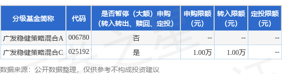 以上内容为证券之星据公开信息整理,由AI算法生成(网信算备310104345710301240019号),不构成 投资建议。 | 分级基金简称 | 代码 | 是否暂停(大额)申购 申购限额 转入限额 定投限额 | | | | | --- | --- | --- | --- | --- | --- | | | | (转入转出、赎回、定投) | (元) | (元) | (元) | | 广发稳健等略混合A 006780 | | 合 | | | | | 广发稳健等略混合C 025192 | | 부 | 1.00万 | 1.00万 | | 证券之星消息,8月14日广发基金管理有限公司发布《关于广发稳健策略混合型证券投资基金C类基金 份额暂停机构投资者大额申购(含转换转入、定期定额和不定额投资)业务的公告》。公告中提示,为 保护基金份额持有人利益,自2025年8月15日起广发稳健策略混合型证券投资基金C类基金份额暂停机 构投资者大额申购(含转换转入、定期定额和不定额投资)业务,下属分级基金调整明细如下: ...