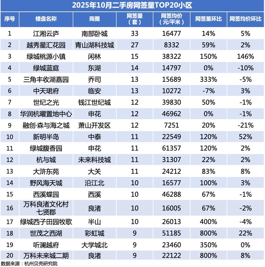 01 继安置房爆红后,杭州又一类二手房,频繁出圈。 它就是杭州非主流地段的"冷门次新房"。 上个月,半山一带的绿城西子田园牧歌,以10套成交,位列10月二手房成交榜第17位,网签量环比暴涨400%。 10月之前,它的二手房,每月成交不过两三套。田园牧歌成交火热的势头,本月还在延续。照这热度,还能继续坐稳成交前20 榜单。 | | | | 2025年10月二手房网签量TOP20小区 | | | | | --- | --- | --- | --- | --- | --- | --- | | 序号 | 楼盘名称 | 南昌 | 政府市 (复) | NEWS TH ( 元/-- 米 | 网登录比 | 网签均价不比 | | 1 | 江湘云庐 | 育部卧城 | 33 | 16477 | 14% | 5% | | 2 | 越秀星汇化元 | 青山湖科技城 | 27 | 8332 | 59% | 2% | | 3 | 绿城桃源小镇 | 丙林 | 15 | 38322 | 150% | 146% | | 4 | 绿城智旺 | 張湖 | 14 | 14797 | 0% | -10% | | 5 | 三角丰收湖嘉园 | 芥可 | 13 ...