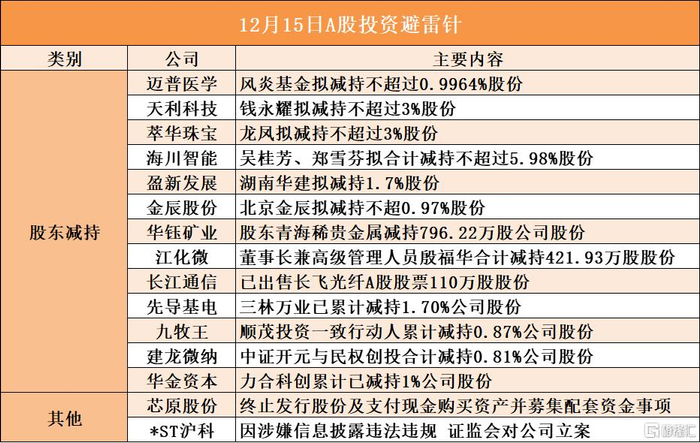 | | | 12月15日A股投资避雷针 | | --- | --- | --- | | 类别 | 公司 | 主要内容 | | 股东减持 | 迈普医学 | 风炎基金拟减持不超过0. 9964%股份 | | | 天利科技 | 钱永耀拟减持不超过3%股份 | | | 英华珠宝 | 龙风拟减持不超过3%股份 | | | 海川智能 | 吴桂芳、郑雪芬拟合计减持不超过5.98%股份 | | | 盈新发展 | 湖南华建拟减持1.7%股份 | | | 金辰股份 | 北京金辰拟减持不超0.97%股份 | | | 华钰矿业 | 股东青海稀贵金属减持796. 22万股公司股份 | | | 江化微 | 董事长兼高级管理人员殷福华合计减持421.93万股股份 | | | 长江通信 | 已出售长飞光纤A股股票110万股股份 | | | 先导基电 | 三林万业已累计减持1.70%公司股份 | | | 九牧王 | 顺茂投资一致行动人累计减持0.87%公司股份 | | | 建成做纳 | 中证开元与民权创投合计减持0.81%公司股份 | | | 华金资本 | 力合科创累计已减持1%公司股份 | | 其他 | 芯原股份 | 终止发行股份及支付现金 ...